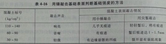 2.混凝土基礎的質量檢查,可用錘敲擊的方法判斷基礎強度,判斷方法見表4-16.